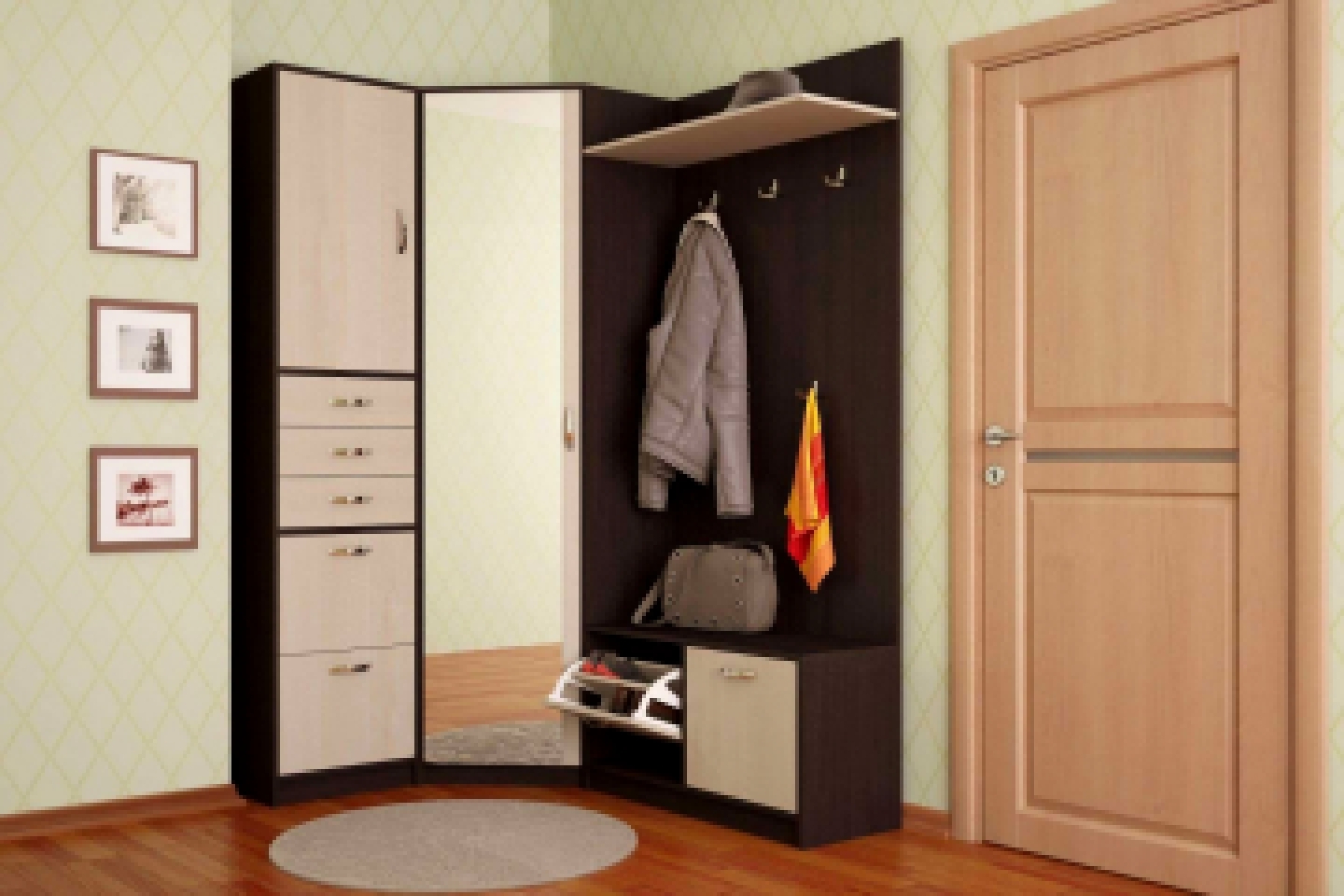 - Угловой. Как правило, угловые шкафы состоят из нескольких секций, соединяющихся между собой. Данная конфигурация считается очень удобной для маленьких прихожих.