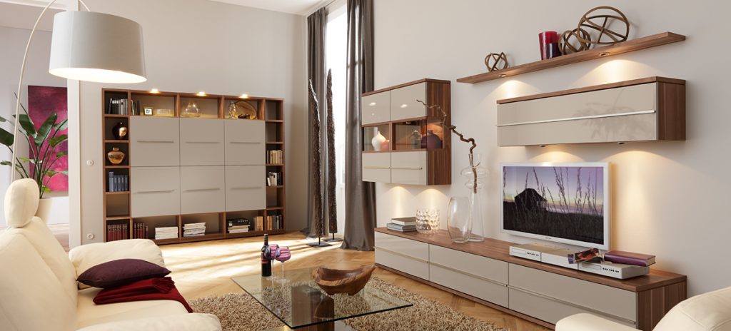 Самым подходящим и функциональным вариантом для гостиной можно считать горки, которые состоят из модулей. Разные элементы этой мебели можно переставлять и менять местами так, как будет угодно хозяину жилища. Кроме того, в любой момент можно будет изменить наскучивший дизайн гостиной, просто поменяв несколько модулей местами.