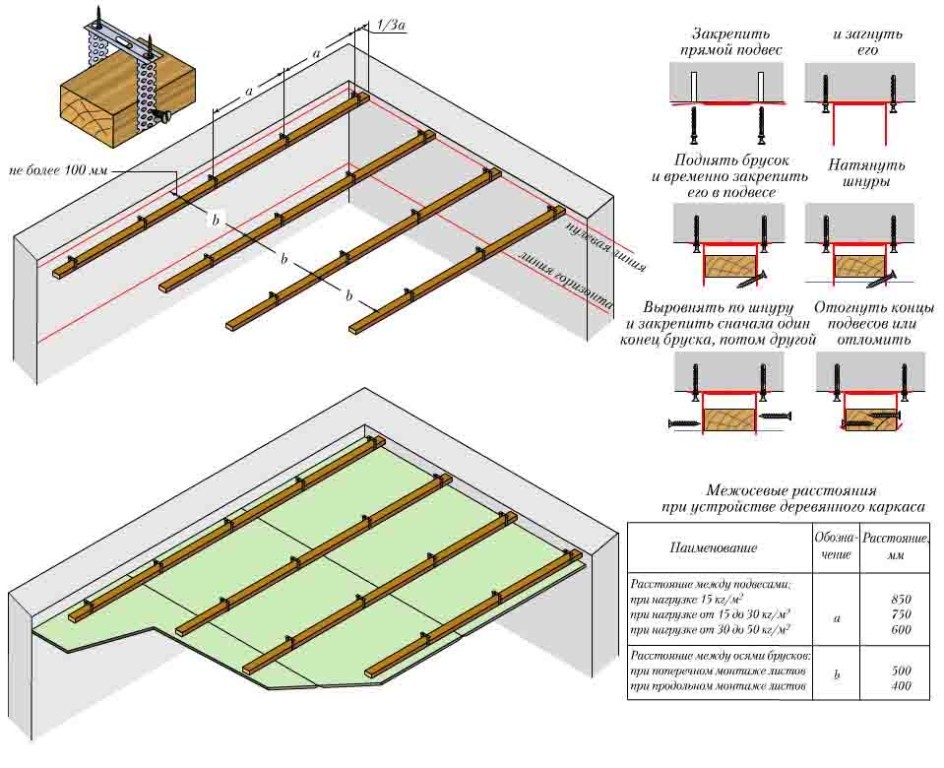 После этого нанесите на каждую стену вертикальные линии с шагом 60 см, на которые закрепите подвесы дюбелями и саморезами.
