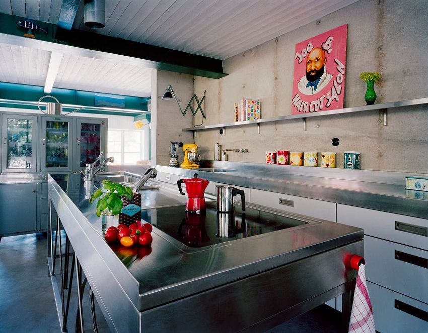 Оригинальность создаёт контраст между грубой отделкой помещения и современным оборудованием в кухне.