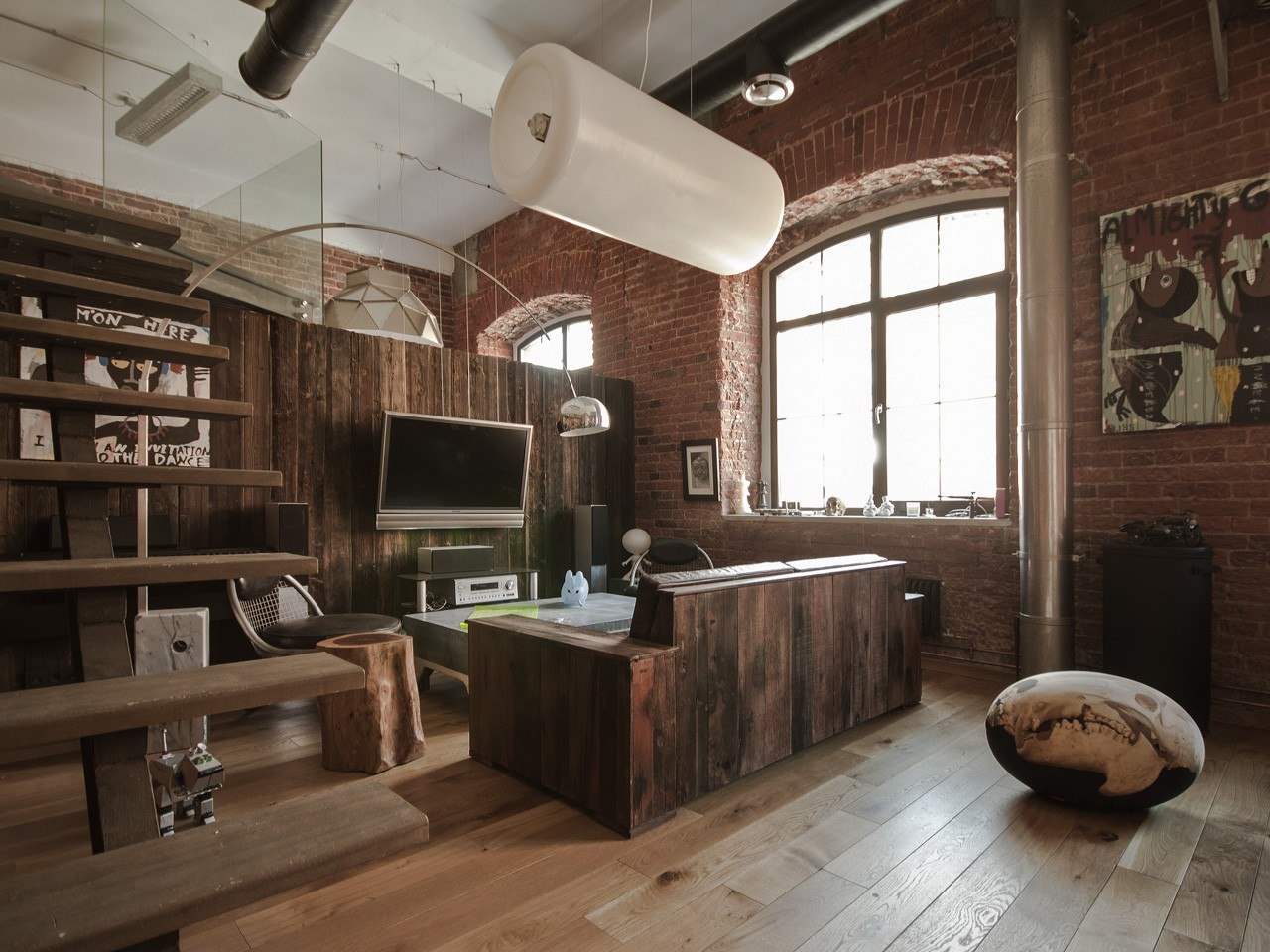 Рабочее место не занимает много пространства в квартире, там должен быть только удобный стол, кресло, стеллажи. Хорошей идеей будет организовать его на лоджии. Отделка в стиле лофт будет там очень уместна.