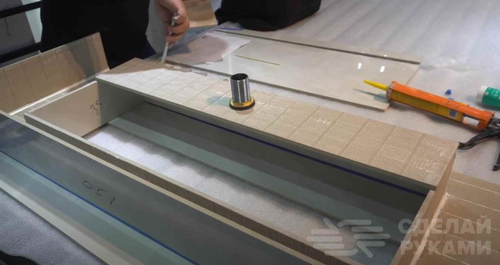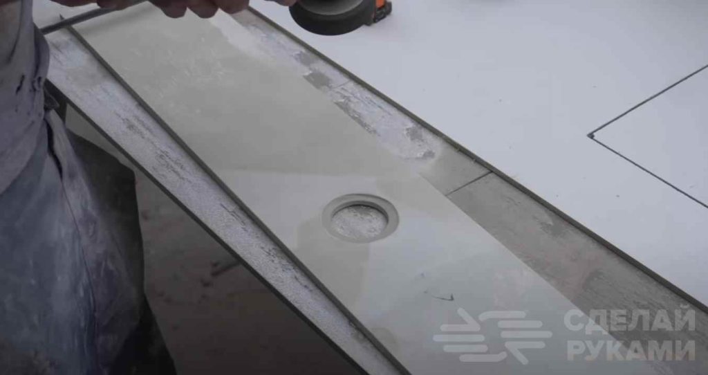 Далее автор отрезает полосу керамогранита, и сверлит в ней отверстие под слив.