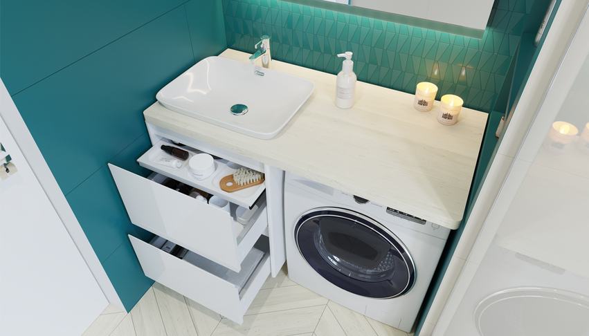 Если под умывальник планируется устанавливать стиральную машину, лучше, чтобы для нее имелось отдельное отделение, а также вырезы для розеток.