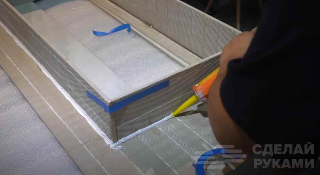 На следующем этапе, после того, как склеили основные детали, необходимо пройти все стыки герметиком. Ждем, пока герметик высохнет.