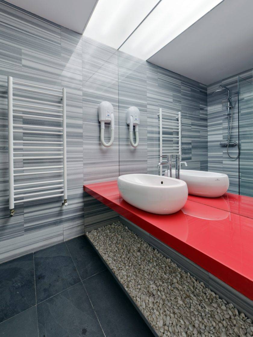 Добиться оригинальности в дизайне ванной комнаты проще всего двумя способами: либо разместить столешницу не совсем традиционным образом по отношению к другим предметам обстановки, либо воспользоваться непривычными материалами.