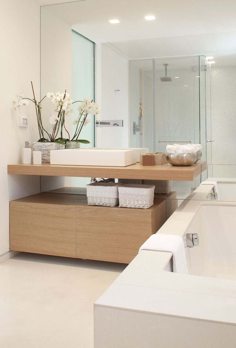 Ванна премиум-класса однозначно требует применения «серьезных» материалов – искусственного или натурального камня, ценных пород древесины (зебрано, ироко). Прослужит «люксовая» столешница как минимум 20 лет, в реальности же высококачественный модуль можно будет оставить в наследство даже внукам.