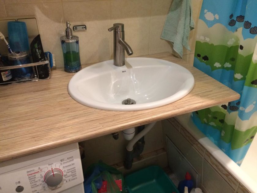 Столешница, которая имеет врезную раковину. Представленный тип является намного дешевле предыдущего, при этом устанавливается довольно просто. Данная конструкция предусматривает установку под неё не только стиральной машины, но и всевозможных ящиков, полочек и так далее. В качестве отрицательной стороны этой модульной столешницы стоит выделить то, что швы возле раковины не защищены. В этой щели, вероятно, будет накапливаться влага, которая приведет к размножению вредоносных бактерий.