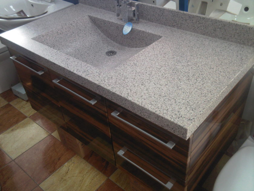 Популярный вариант в современных интерьерах — столешница для ванной из искусственного камня. Искусственный камень представляет собой композитный материал, который делается из крошек натуральных минералов и полимеров. Такой материал ничем не отличается от натурального.