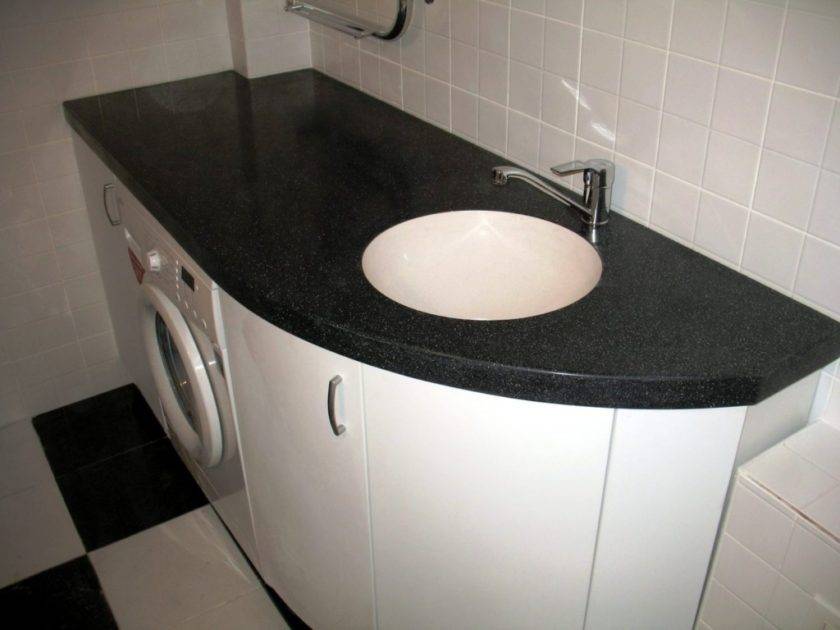 Иногда встречаются и варианты, когда столешница накрывает расположенные рядом с раковиной предметы: стиральные машины, корзины для белья или какие-то шкафчики.