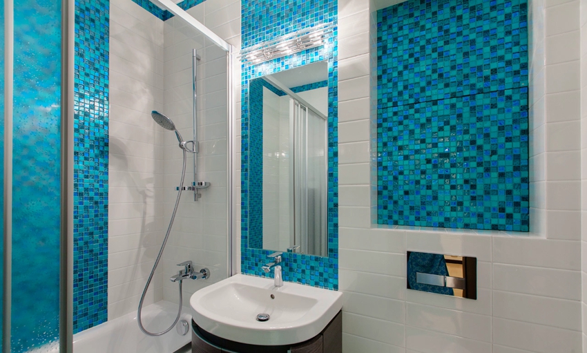 Облицовка мозаикой полочек из гипсокартона в ванной