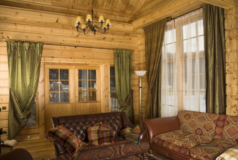 Интересный вариант – шторы модерн в гостиную. Они внушительной длины, так как в загородном доме высокие потолки для стиля – непременное условие, однотонного цвета и красивой драпировки