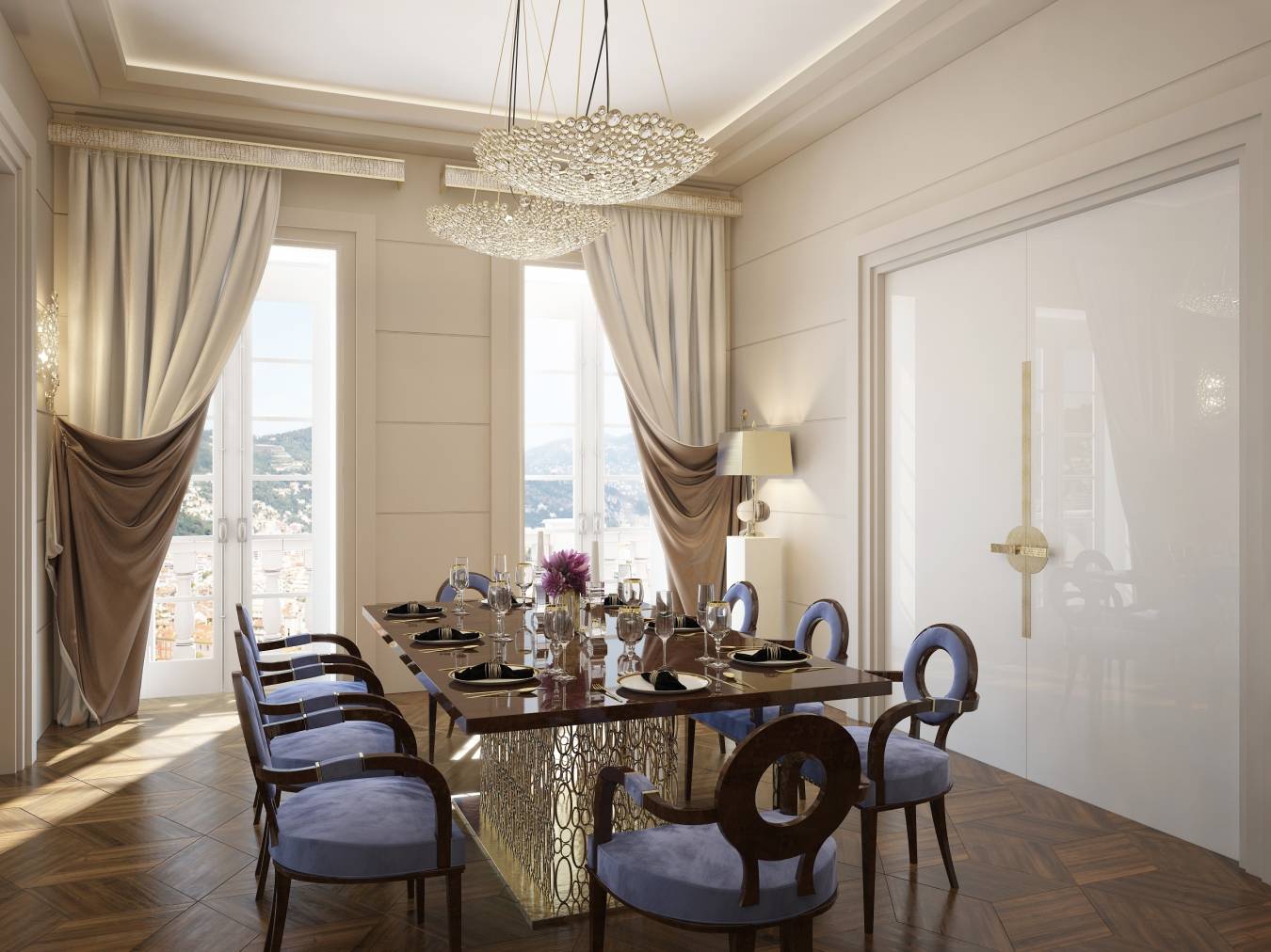 В обеденной зоне уместно повесить минималистические портьеры и тюль.