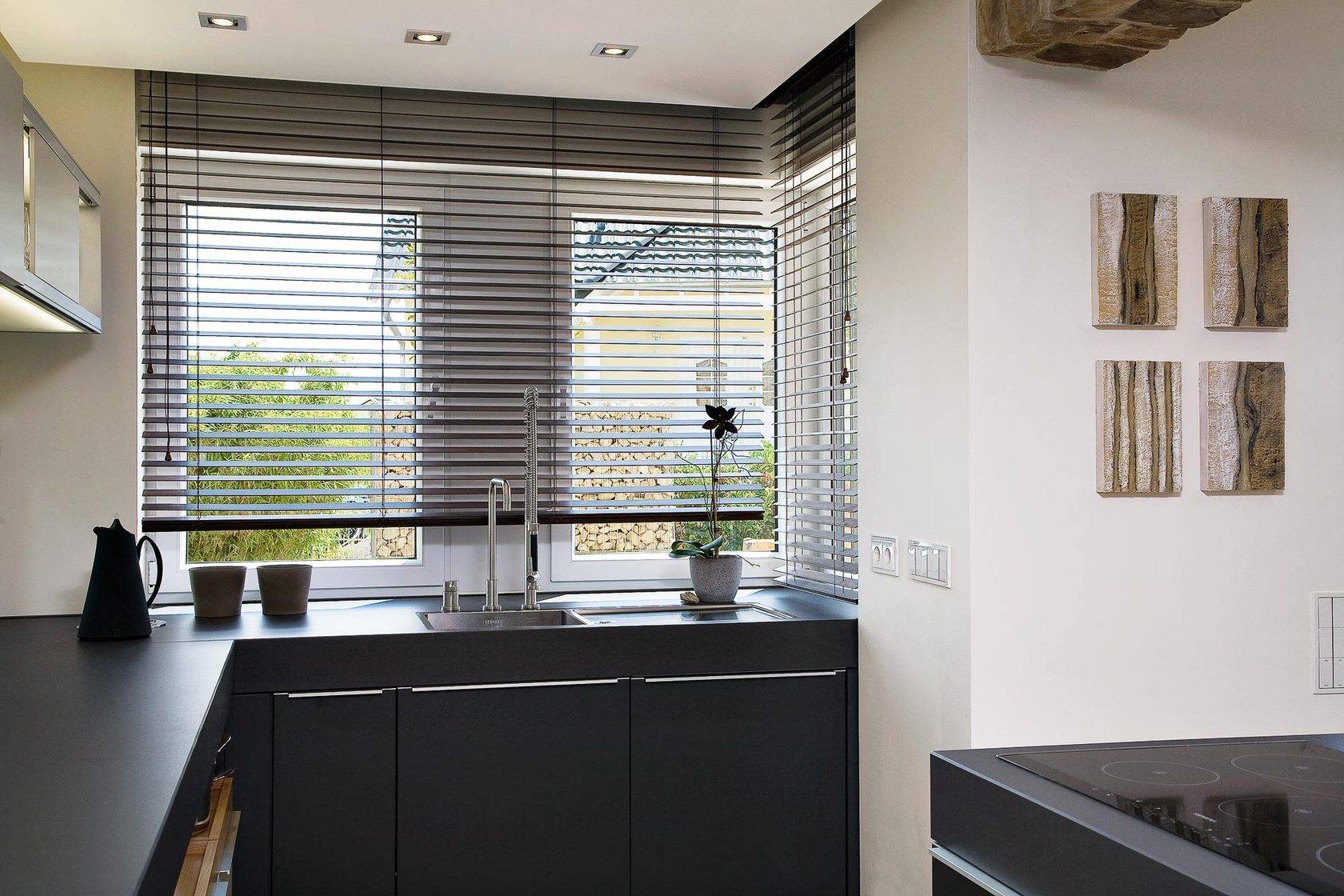 Если кухня совмещена с гостиной, на окно в зоне приготовления пищи вешается римская штора. Во второй половине комнаты уместно разместить тюль и портьеру, соответствующие минималистичному стилю.