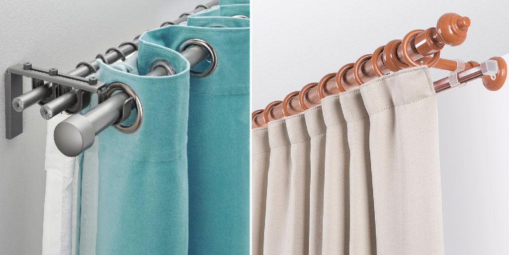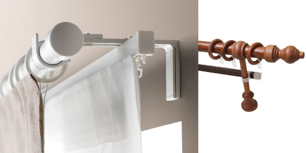 Крепят на потолок или стену с помощью держателей. Отличаются длиной, диаметром, материалом, цветом. Удобный вариант — раздвижной, где регулируется длина карниза.