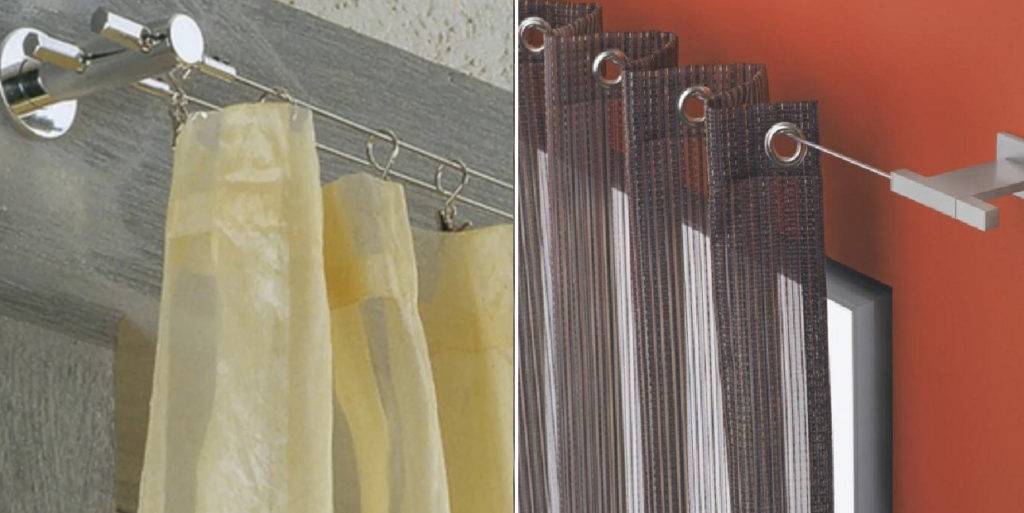 Крепится на потолке, стене или внутри окна. Конструкция представляет собой струну, натянутую между двух кронштейнов. Помогают обыграть эркеры и углы.