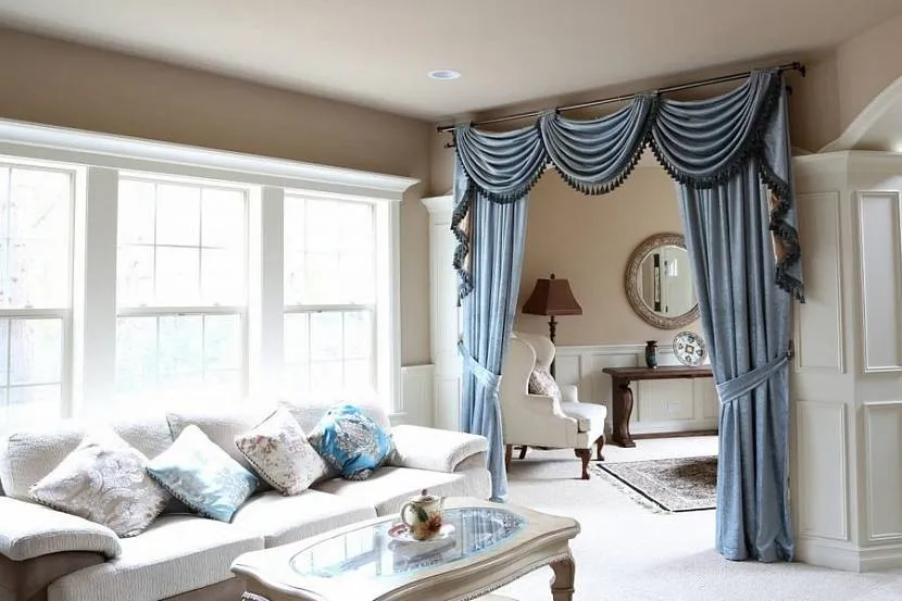 Межкомнатные композиции штор придают гостиной комнате декоративный эффект, уравновешенность и пластичность. В результате стандартная планировка помещения становится более разнообразной, а переход между соседними комнатами получается плавным.