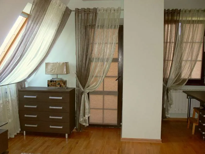 - Зонирование пространства. В некоторых случаях не всегда есть возможность поставить деревянную дверь: рядом стоит шкаф, при установке дверь займет много пространства и другие причины. В данном случае шторы помогут разделить помещение.