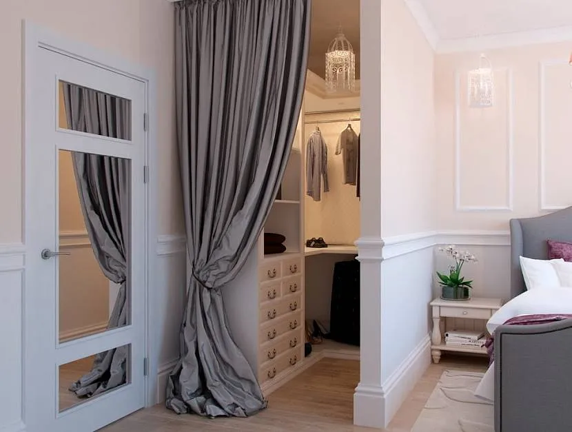 В гардеробной рекомендуется использовать более плотные портьеры, которые не пропускают свет и способны полностью скрыть от посторонних глаз находящиеся в помещении вещи. Например, можно использовать силиконовые шторы, которые прекрасно подходят и на двери других помещений.