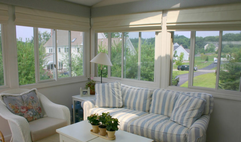 На поверхность стеклопакета шторы монтируют при помощи струн либо лент, которые натянуты между стенами.