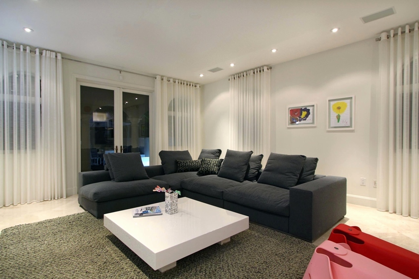 А окна таких гостиных драпируются длинными плотными портьерами на кольцах, надежно скрывающими домочадцев от посторонних взглядов с улицы. Они подбираются либо в тон основным предметам меблировки, либо в цвет потолка, чтобы создать иллюзию еще большего расширения пространства.