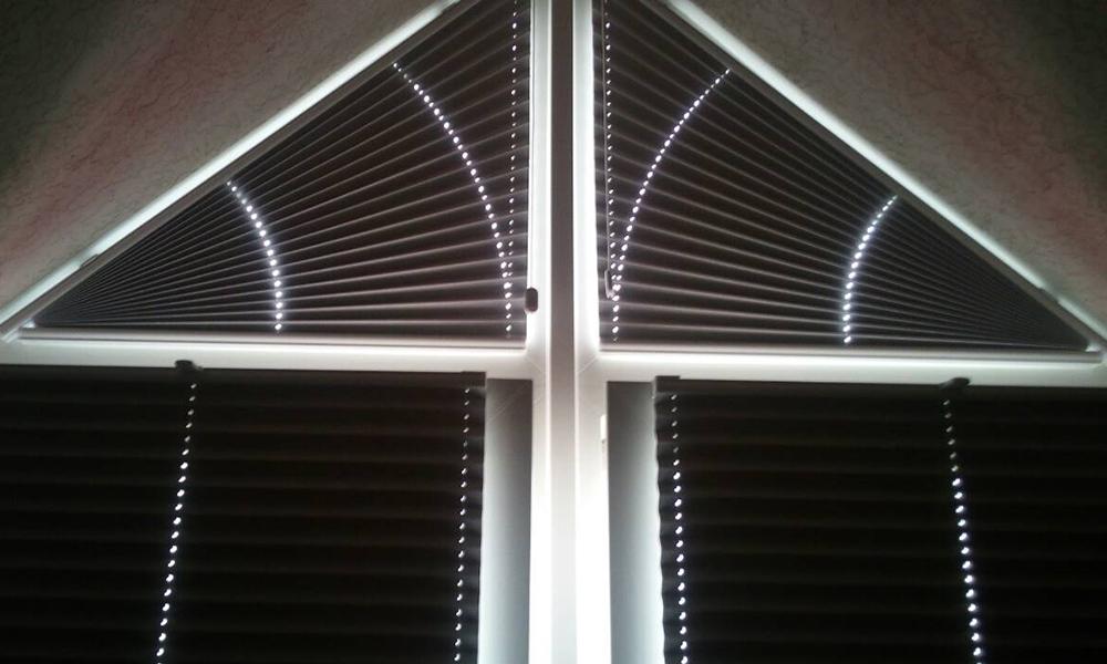 Достаточно дорогостоящая, но очень эффектная модель для таких случаев – плиссе; На треугольном окне жалюзи плиссе можно повесить радиальным способом, от центра, создавая интенции солярного символа в интерьере