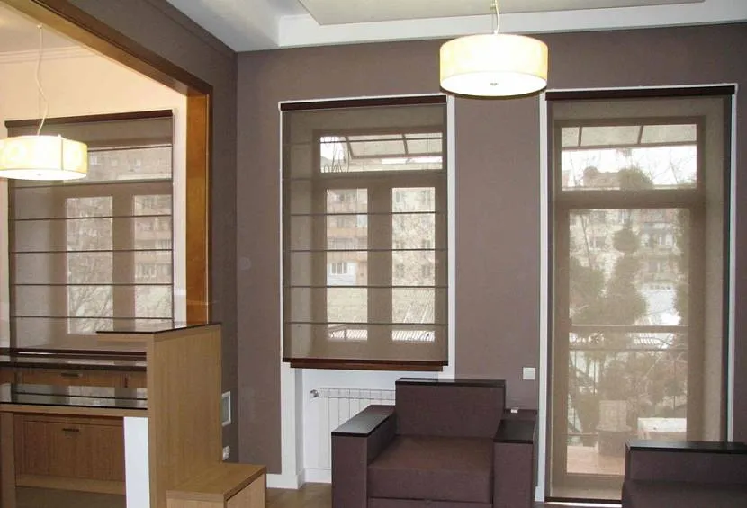 Шторы-жалюзи поднимаются при помощи ролетных механизмов. Изготавливают из тканей с защитными пропитками. Они оберегают полотно от загрязнения, упрощают уход, удерживают форму. Изготавливают шторы плиссе, с мелкими поперечными складками, двигаются сверху и снизу. Горизонтальные жалюзи состоят из отдельных полос разной ширины. Соответственно названию, раздвигаются по горизонтали.