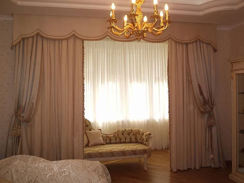- Сложные, слегка помпезные шторы на дверной проём: «императорские», «рукав епископа». Для первых характерны разного рода ламбрекены, дополнительные элементы декорирования. Характерным признаком «рукава епископа» является использование нескольких подхватов по всей длине полотна.
