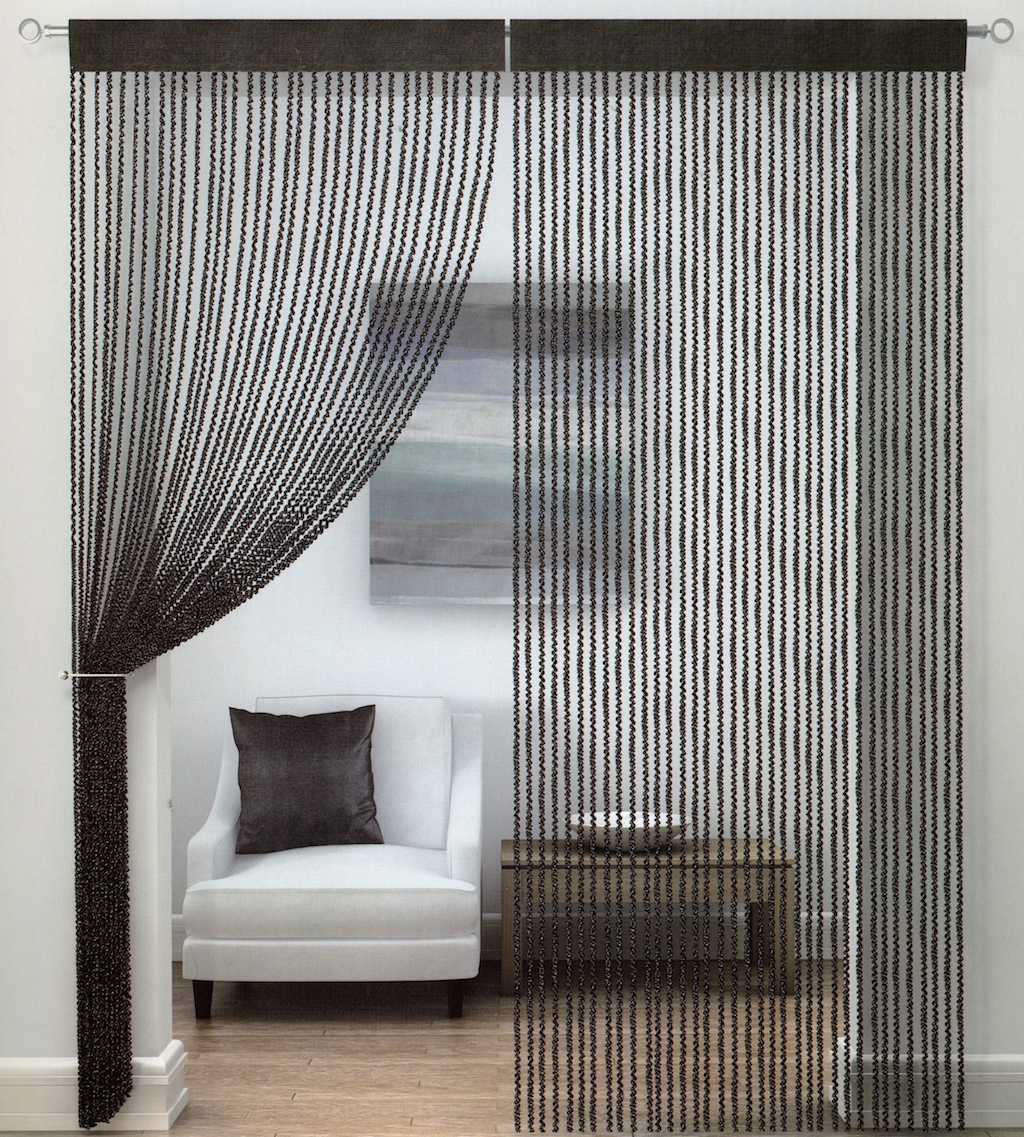 Этот подвесной элемент декора очень эффектно смотрится в дверных проемах. Веревочные занавески изготавливают из стекляруса или тонких палочек. Они придают помещению больше красок и яркости.