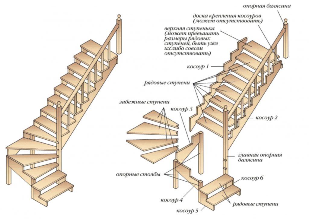 Лестница на второй этаж требует основательного подхода к выбору конструкции, для этого желательно знать, из каких элементов она состоит. Рассмотрим на примере поворотной лестницы с забежными ступенями.