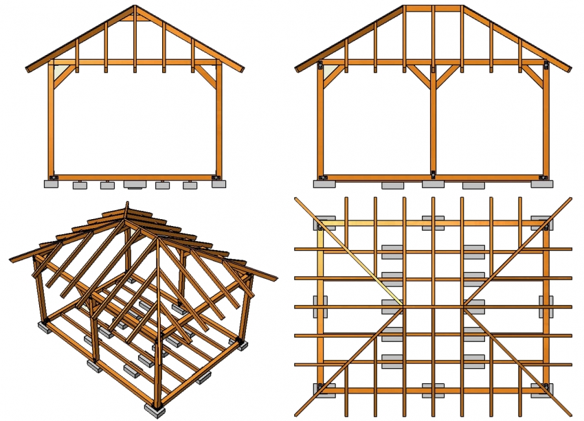Имея перед собой схему стропильной системы, можно приступать к возведению деревянного каркаса. Для начала необходимо установить основные элементы конструкции, на которые крепятся стропильные ноги.