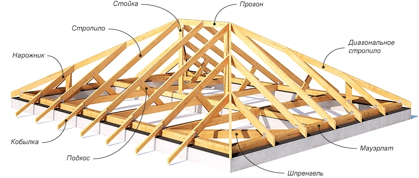 Стропильная система подразумевает деревянную конструкцию, выполняющую функцию опоры для четырехскатной кровли.