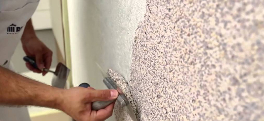 Перед тем как приступать к оформлению стен, необходимо тщательно подготовить основание. Поверхность очищают от старого декоративного слоя. Если есть места, где базовая штукатурка отслоилась или появились крупные трещины, их зачищают и заделывают.