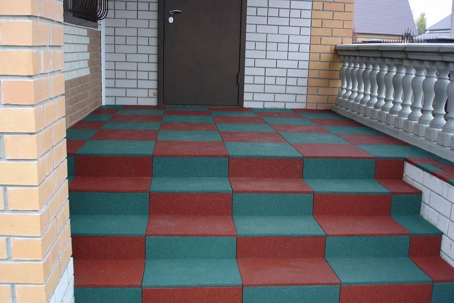 Из прессованных гранул также изготавливаются готовые полноформатные накладки для лестниц крыльца на улице. Толщина покрытия ступени до 20 мм, ширина 500 мм, материал не боится масла или бензина, хорошо переносит ультрафиолет, жару и замораживание. Таким материалом очень удобно облицовывать ступени из тротуарной плитки и бетона.