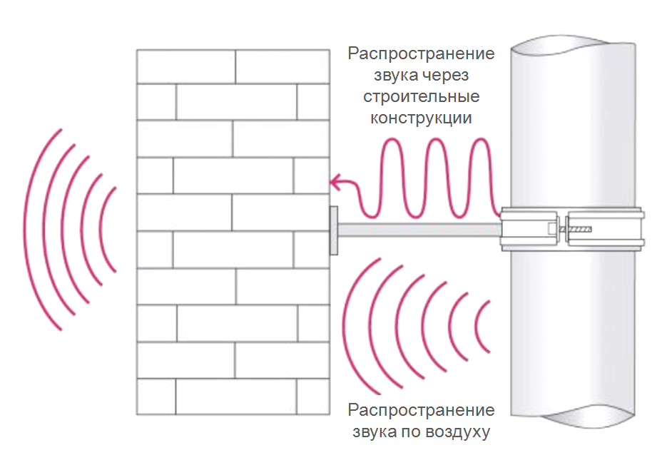 Резонансные явления в трубе вызывают не только вибрацию ее стенок, но и знакопеременные деформации (изгиб, растяжение/сжатие) тела трубы, т.е. трубы в целом. Звук от вибрации стенок передается в комнаты непосредственно, а знакопеременные деформации, кроме того, воздействуют на конструкцию здания.