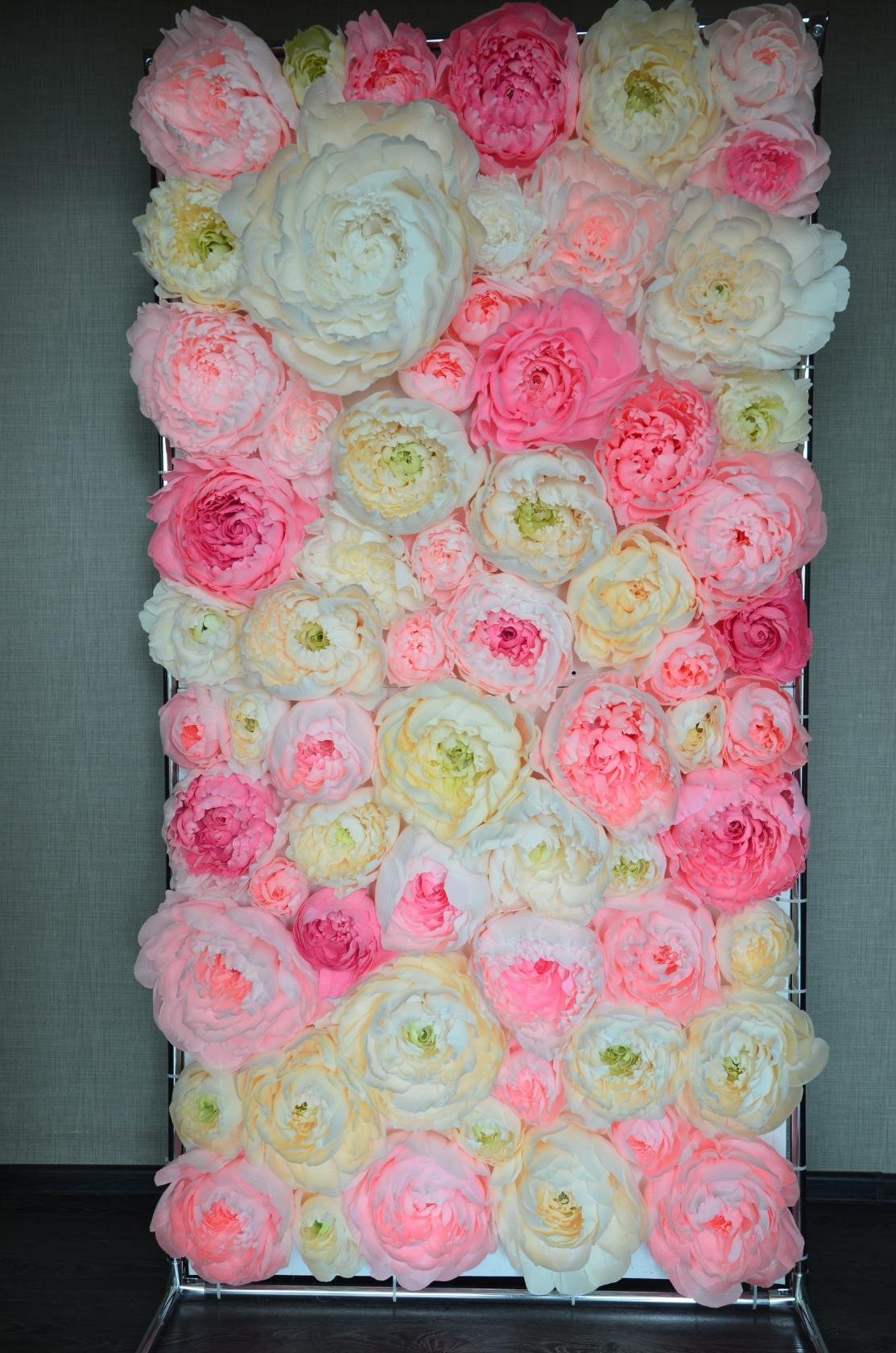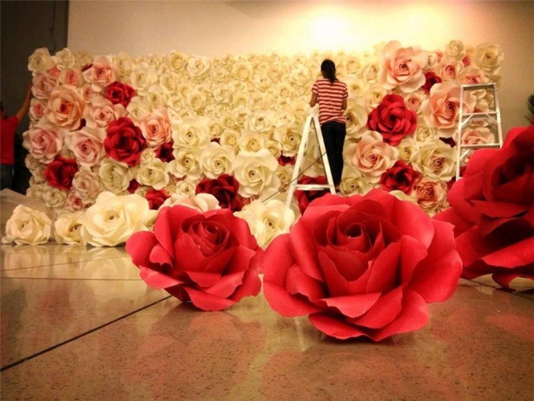 Оформление свадебного зала цветами может быть также сделано своими руками из бумажных цветов. Многие могут считать, что выглядит это дешево, а также связывать этот момент с суевериями. Однако, модные тенденции берут свое и огромные бумажные цветы не только прочно вошли в моду, но ими украшают залы, площадки для фотосессий, невесты добавляют подобные цветы в свадебные букеты.