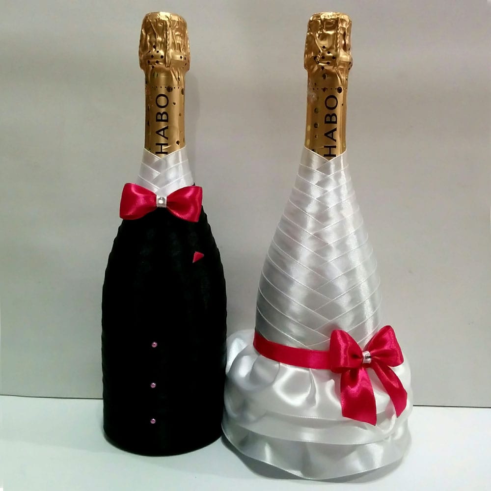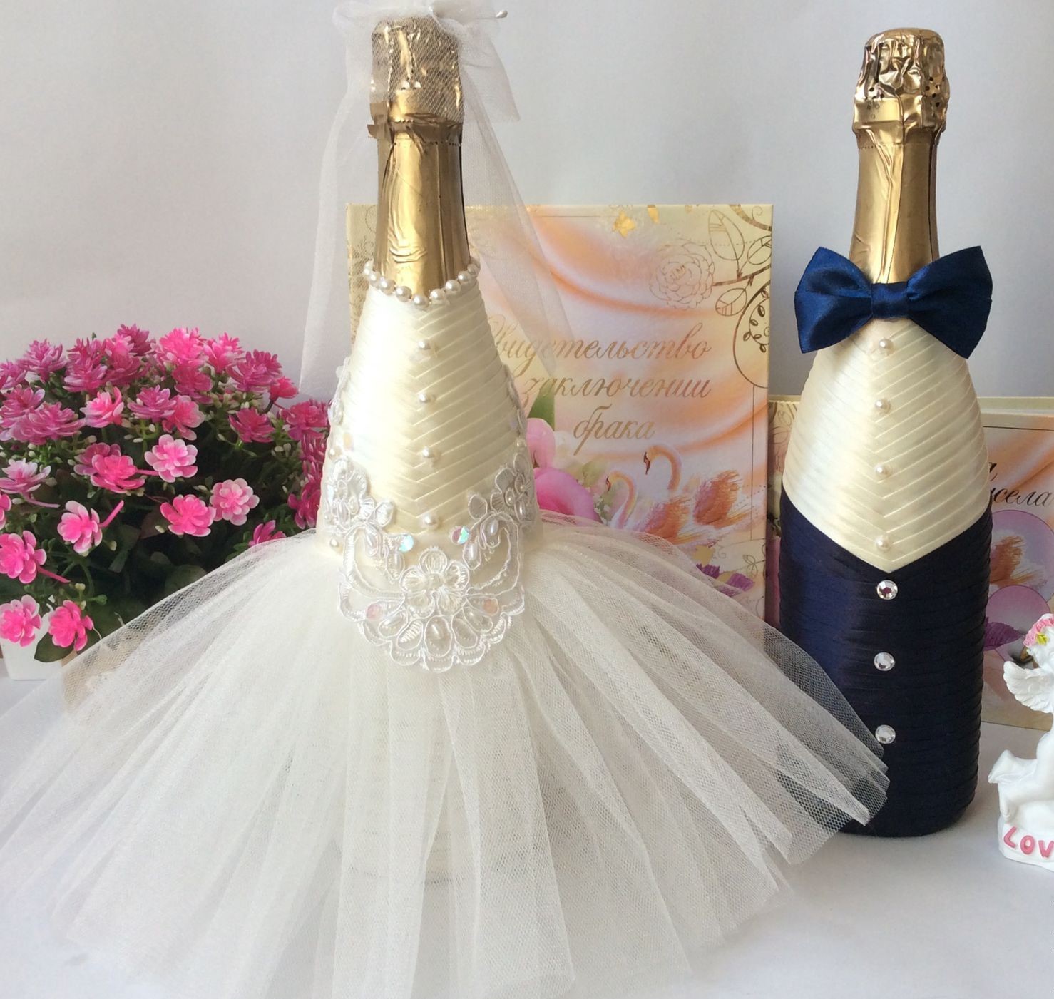 - бутылки шампанского с оригинальным и красивым декором, выполненным при помощи различной свадебной мишуры: лент, бантов, бусин, кружев и прочих элементов;