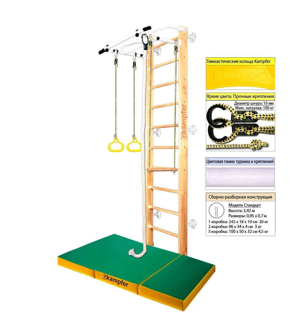 В состав конструкции входит лестница длиной от потолка до пола, в верхней части которой установлен турник. Возле стенки могут крепиться спортивные снаряды (брусья, кольца, веревочная лестница, канат, боксерская груша и пр.). Наиболее экономичный вариант – это рамка с поперечными перекладинами.