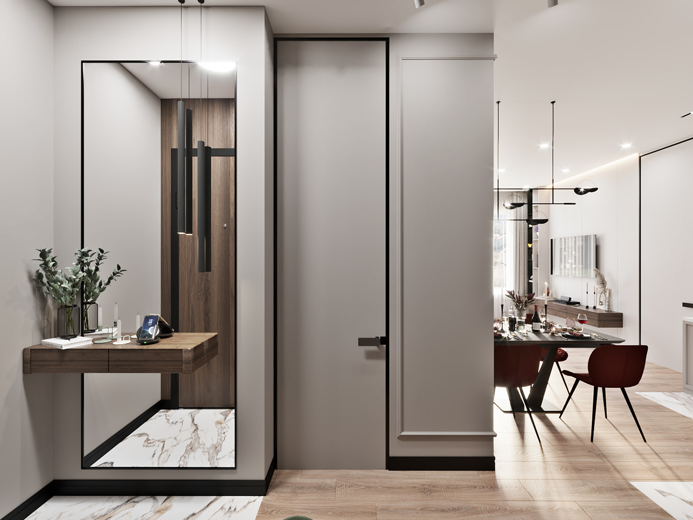 - Сочетание большого зеркала в темной раме, расположенного напротив входа, зрительно увеличит площадь.