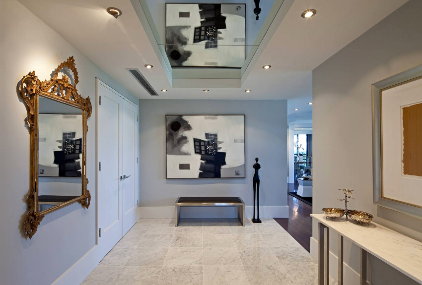 - В коридор лучше подобрать несколько небольших ламп. Натяжные или потолки из гипсокартона можно дополнительно осветить парящей подсветкой. Но пересмотрите дизайнерские работы с этой техникой, иначе есть риск получить не очень современный и даже откровенно устаревший интерьер.