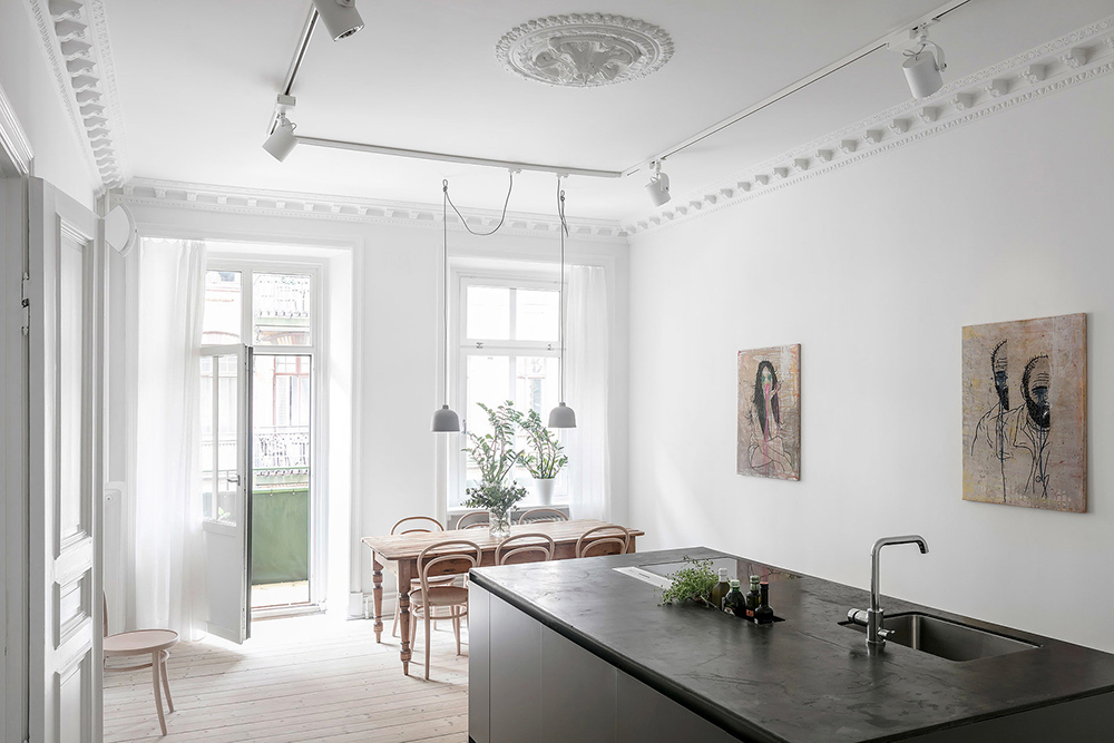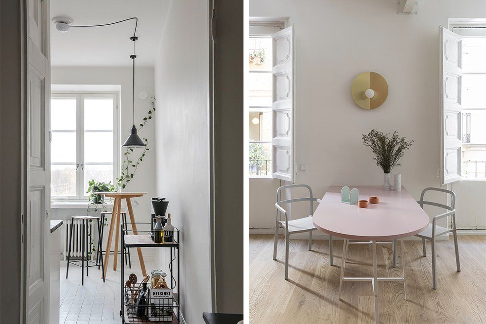Дощатый пол во всей квартире заменили натуральным паркетом, стены просто покрасили в белый и нежный персиковый оттенки. Вместо старых деревянных окон установили современные энергосберегающие стеклопакеты. Базовая мебель довольно бюджетная, практически вся она была приобретена в Икеа. Впоследствии супруги поработали над её внешним видом и украсили шёлковой контрастной обивкой в этно-стиле.