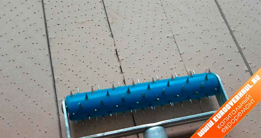 - Берут валик (игольчатый) и хорошо им проходятся по нужному отрезку материала. Затем производят смачивание, усердствовать не нужно. Оставляют все на пару часов, после этого можно начинать сгибание ГКЛ для арок.