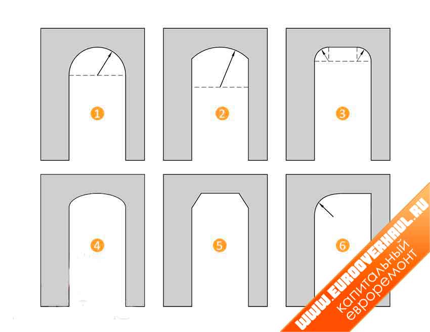 Фото популярных форм арок из гипсокартона. 1. Классическая округлая арка. 2. Модерн. 3. Романтика. 4. Эллипс. 5. Трапеция. 6. Полуарка.
