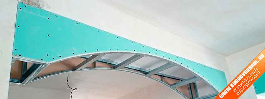 Арка из гипсокартона своими руками – не получится без этого элемента. Он представляет собой согнутый дугообразно фрагмент, который будет служить «крышей» арочного дверного проема. А также закроет весь внутренний каркас.