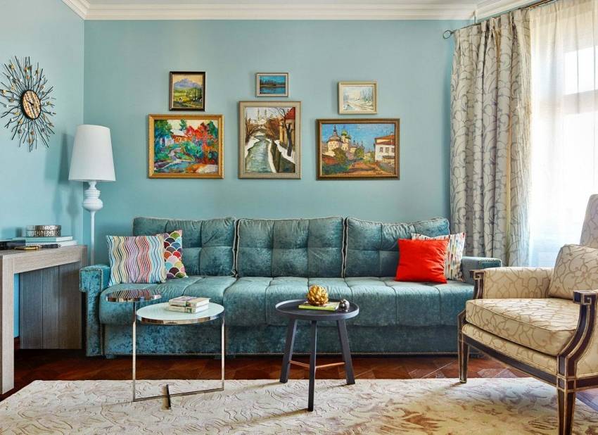 Легкости гостиной может придать сочетание нежно-голубого и бежевого цветов