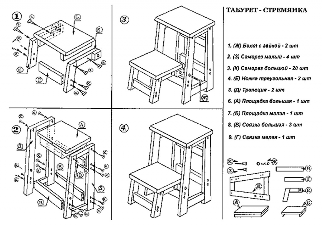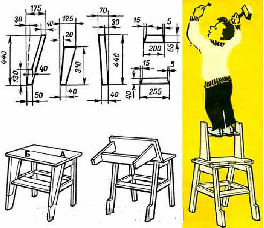 Каков процесс изготовления такого стула-стремянки? Необходимо в следующей последовательности выполнить порядок действий: