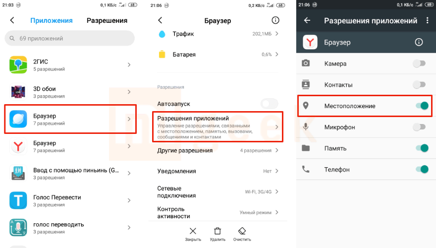 и в разделе «Разрешения»