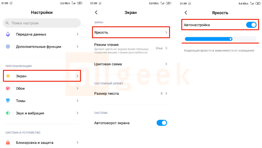 Данные настройки находятся в пункте «Экран» – «Яркость».