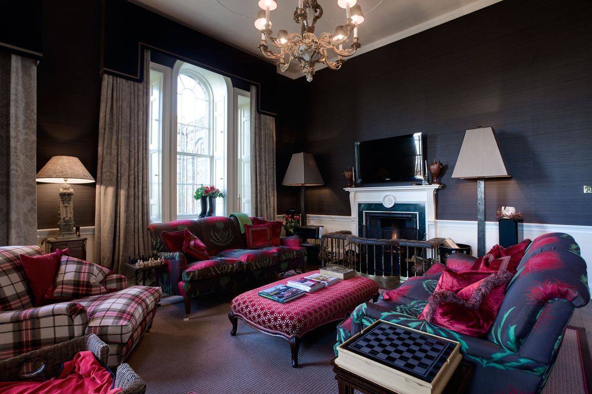 Используют чёрный и для создания камерных салонов в богатых домах. Кремовый текстиль и тёплый свет приятно смягчают коричневато-чёрные стены, а броская мебель в глубоком синем и пунцовом оттенке вносят нотку пикантности. Такой подбор цветовой схемы указывает на современность интерьера, воссозданного по мотивам староанглийских домов. В такой гостиной хочется обсудить горячие сплетни или устроить романтический ужин наперекор чопорным традициям.