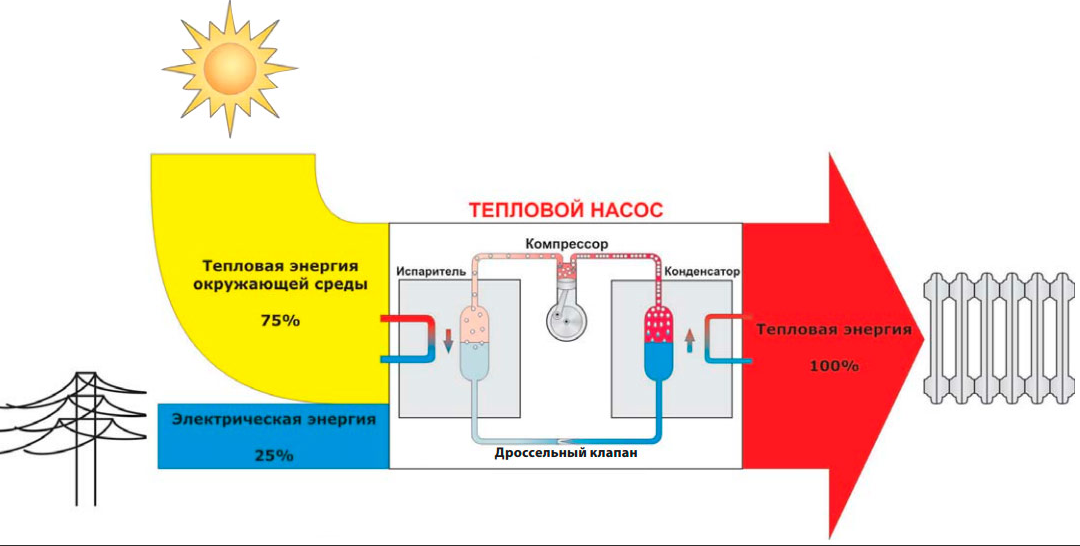Принцип работы теплового насоса. Тепловой насос отбирает низкопотенциальное тепло у воздуха (-25…+35 градусов), у воды (+2…+7 градусов), у грунта (-5…+5 градусов), охлаждая эту среду на несколько градусов. Фреон во внутреннем контуре теплового насоса закипает и превращается в газ, компрессор сжимает газ, у которого резко уменьшается объем, но увеличивается давление и температура, далее разогретый фреон передает тепло через теплообменник в систему отопления. Далее цикл повторяется.