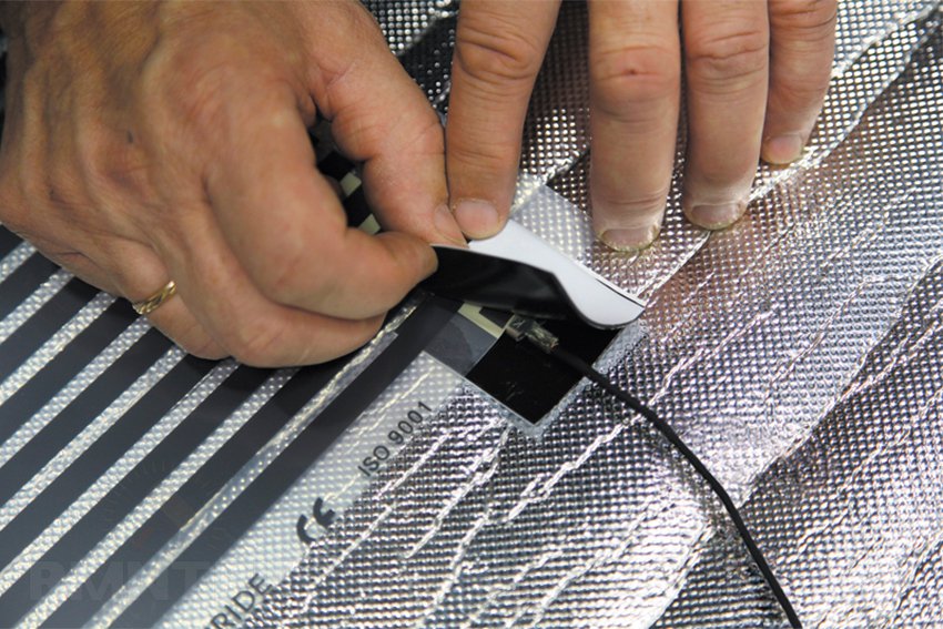 - Монтаж ИК пленки. Согласно схеме укладывается разрезанная пленка, затем она фиксируется на слое теплоизолятора двухсторонним скотчем.